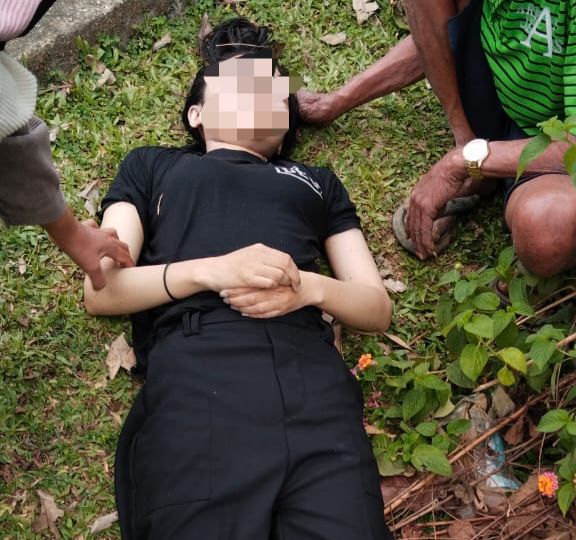 Berdasarkan foto yang beredar luas di grup WhatsApp, terlihat seorang perempuan menggunakan baju kaos dan celana panjang berwarna hitam tergeletak di tanah dengan kondisi seluruh badan terlihat pucat pasi.