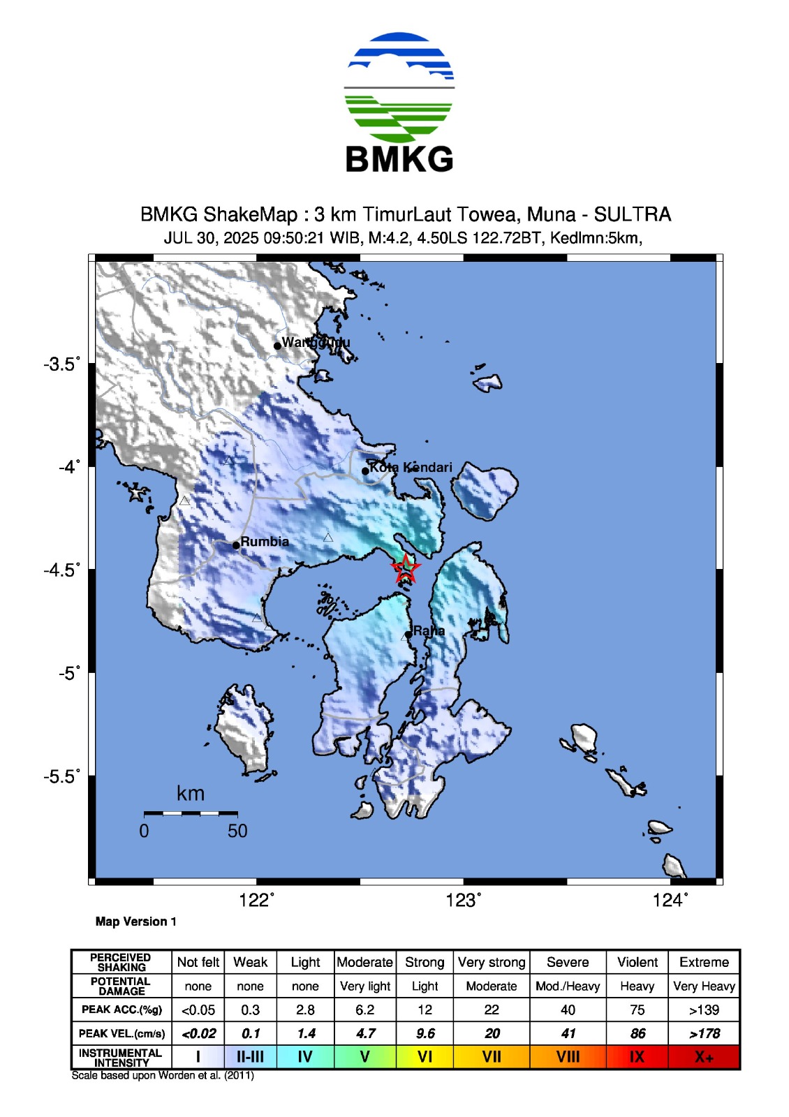 Berdasarkan keterangan Kepala Kantor Geofisika Kendari, Rudin menyampaikan Hasil analisis BMKG menunjukkan informasi gempa bumi ini berkekuatan M4.2. Episenter gempa bumi terletak pada koordinat 4.50 LS, 122.72 BT, atau tepatnya berlokasi di darat pada jarak 3 km Timur laut Towea, Muna, Provinsi Sulawesi Tenggara, pada kedalaman 5 km.
