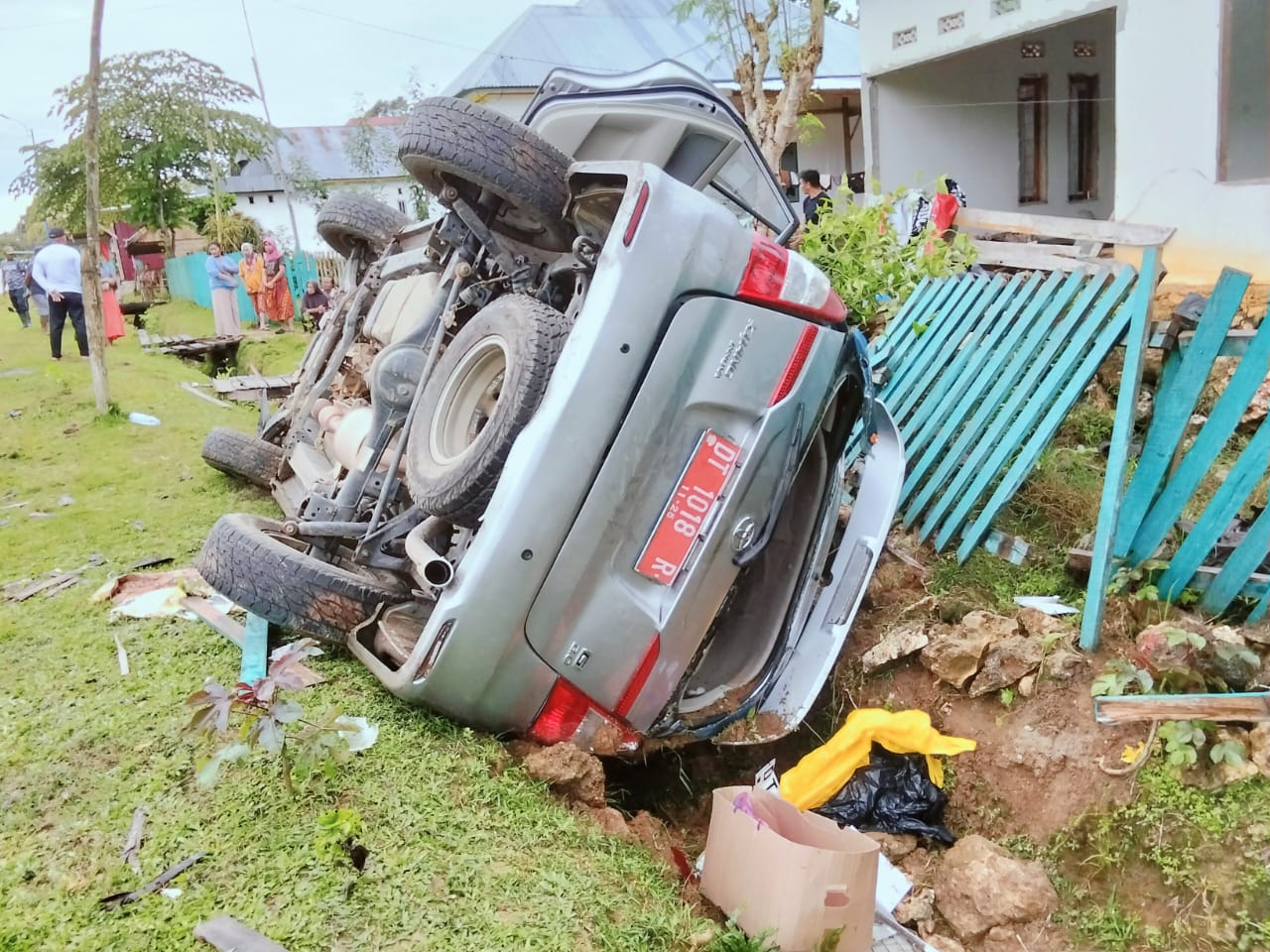 Berdasarkan video yang beredar bahwa mobil dinas Bappeda merk Toyota Inova Silver dengan nomor polisi DT 1018 R terguling menabrak pagar rumah seorang warga di Desa Liabalano.